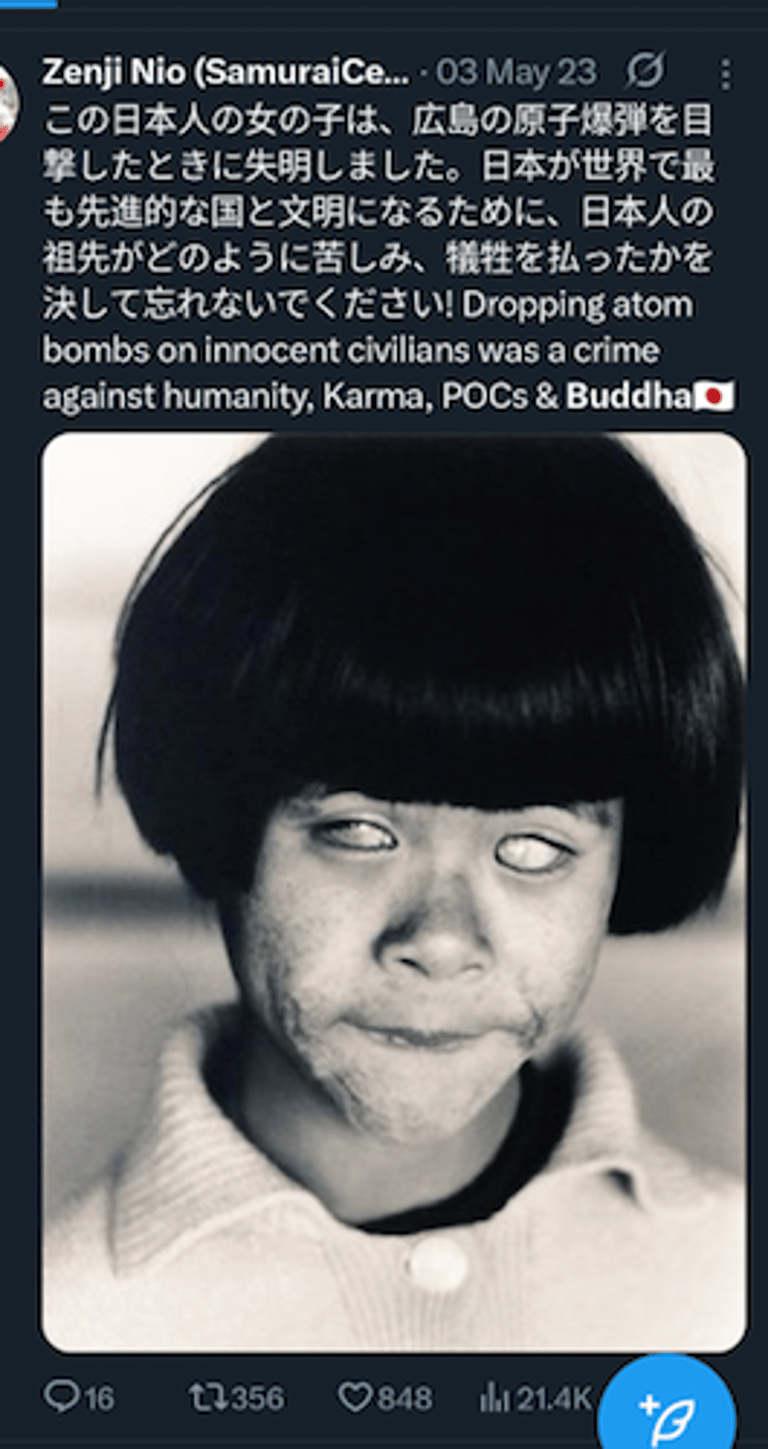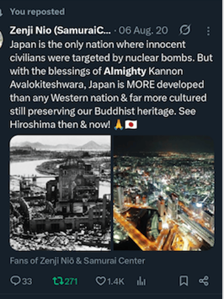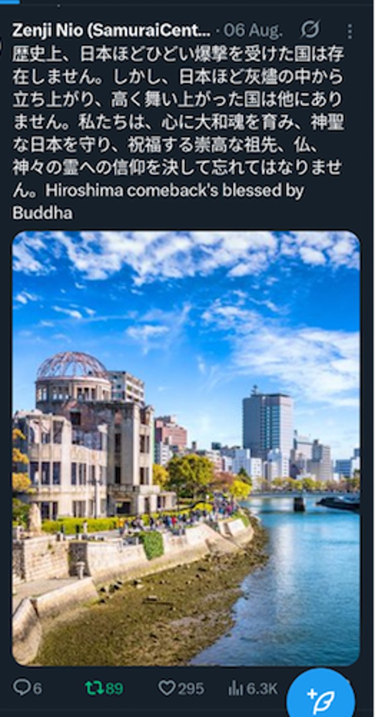Mandela said dropping atomic bombs on innocent civilians was the worst act of terrorism ever -- and Zenji Nio & Samurai Center have participated in many events to honor the victims. Zenji Nio agrees with the Samurai Credo that the only way to defeat the violence of evildoers is to have the capacity to perpetrate even more violence upon them when needed. As the Samurai Buddhist credo says - when attacked by a swordsman, draw your sword instead of reciting poetry". Japan must maintain a very strong military force to be able to repel all attacks & protect the nation.